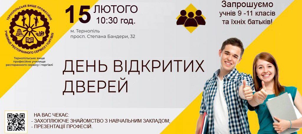 Шановні батьки випускників 9-х та 11-х класів, мрієте про успішне майбутнє для своєї дитини?Вибір професії – це перше серйозне рішення у житті вашої дитини. Запрошуємо вас разом відвідати ТВПУ ресторанного сервісу і торгівлі, щоб переконатися: професійна освіта сьогодні – це престижно, сучасно та перспективно. Ми покажемо, що училище – це не просто навчання, а старт успішної кар’єри.Чекаємо на вас! Допоможіть дитині обрати впевнене майбутнє!Зробіть крок до успіху разом із нами!