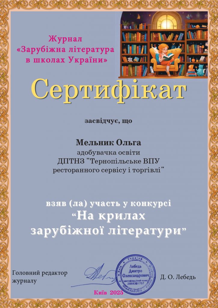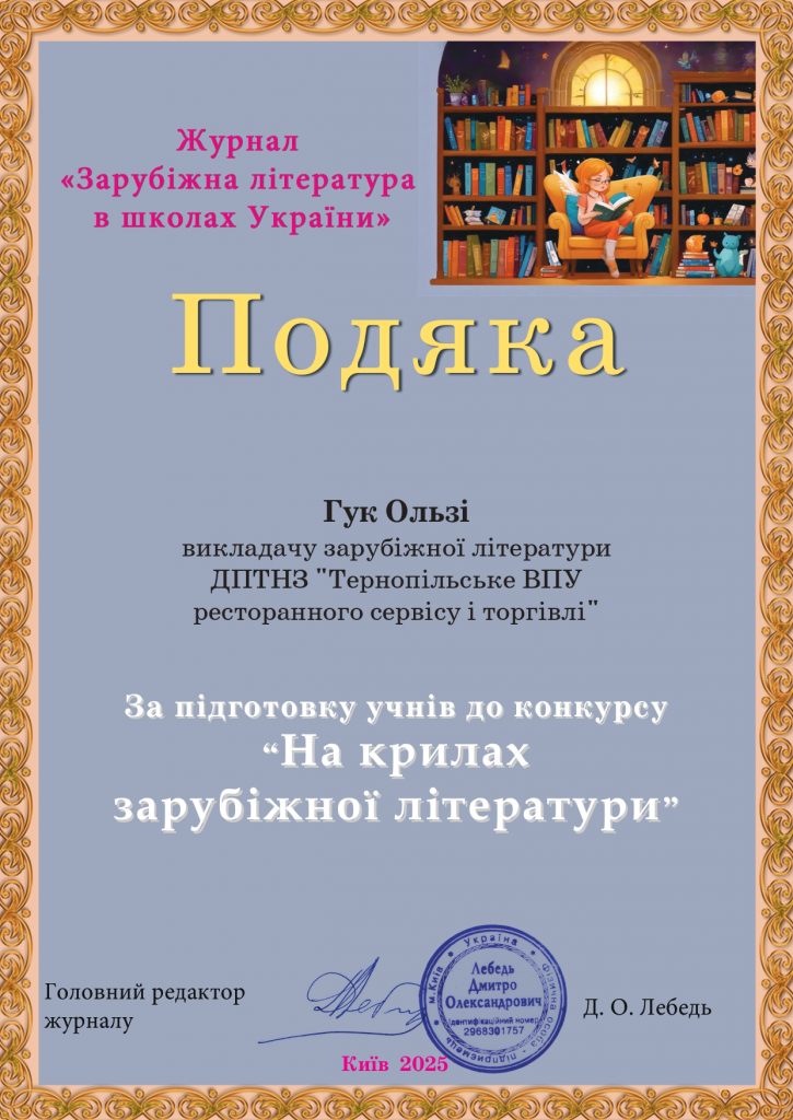 🎓 Маємо приємну новину! Викладачка зарубіжної літератури Ольга Гук отримала подяку від журналу «Зарубіжна література в школах України» за підготовку учениці до конкурсу «На крилах зарубіжної літератури».