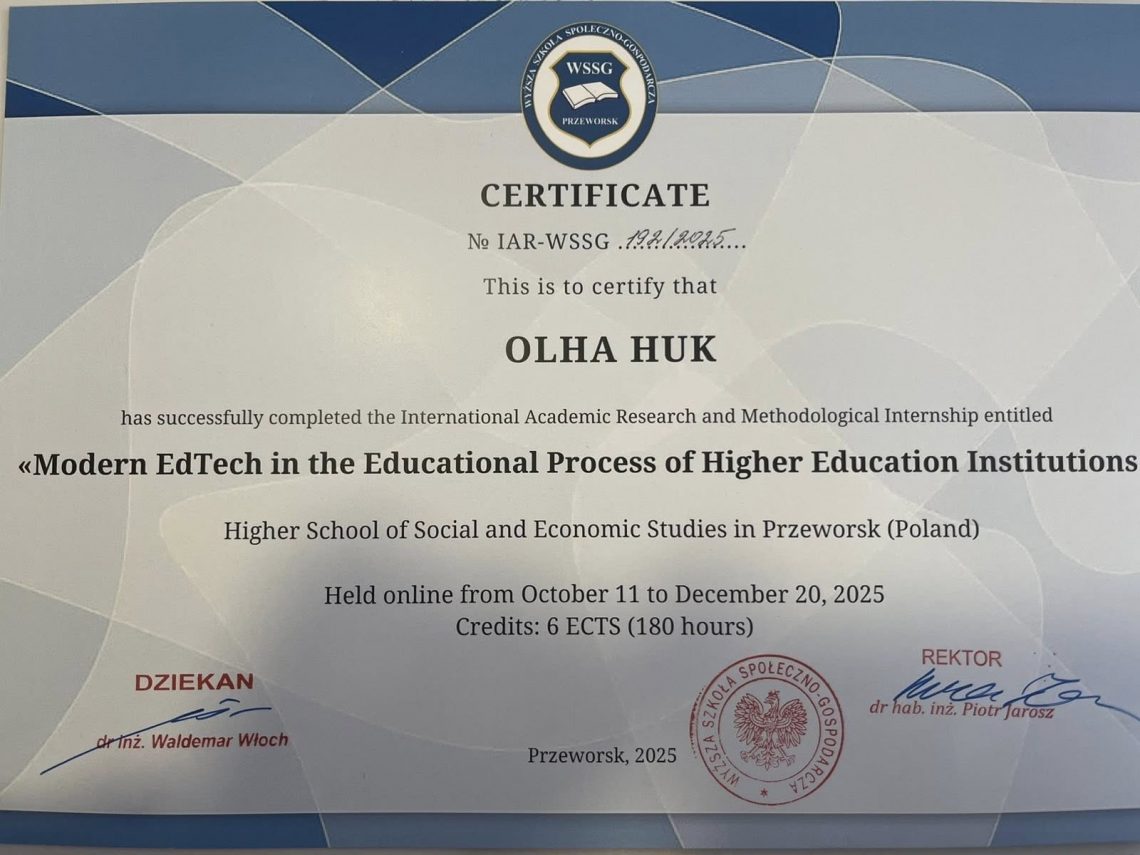 Сертифікат міжнародного зразка отримала методист Ольга Гук, підтвердивши фахову компетентність та готовність впроваджувати європейські підходи в освітню діяльність.«Використання сучасних цифрових технологій у освітньому процесі» — міжнародне стажування, організоване Європейською асоціацією інноваційної освіти (Україна) у співпраці з Вищою соціально-економічною школою (Польща).