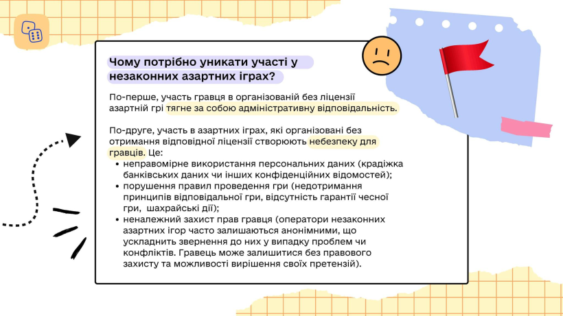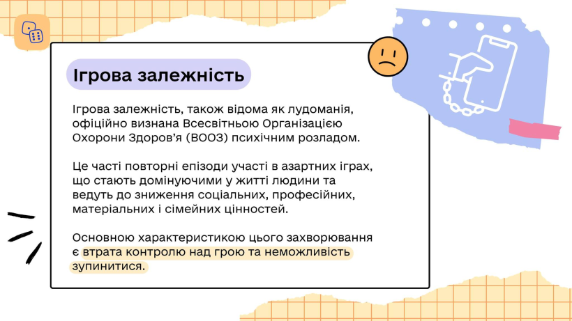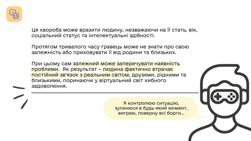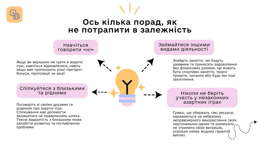 Комісія з регулювання азартних ігор і лотерей підготувала електронну брошуру для здобувачів освіти закладів професійної освіти. Матеріал спрямований на підвищення обізнаності молоді щодо ризиків азартних ігор, формування відповідального ставлення до власного вибору та усвідомлення можливих наслідків ігрової залежності.