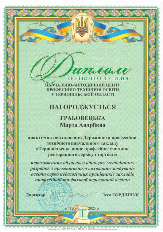 Диплом третього ступеня здобула практична психологиня Марта Грабовецька з темою «Stop-кадр: як зупинити булінг і створити безпечний простір».