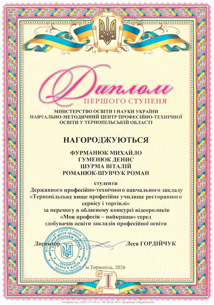 Сьогодні відбулося вручення диплому І ступеня переможцям ІІ етапу обласного конкурсу відеороликів «Моя професія — найкраща» серед здобувачів освіти закладів ПТО.